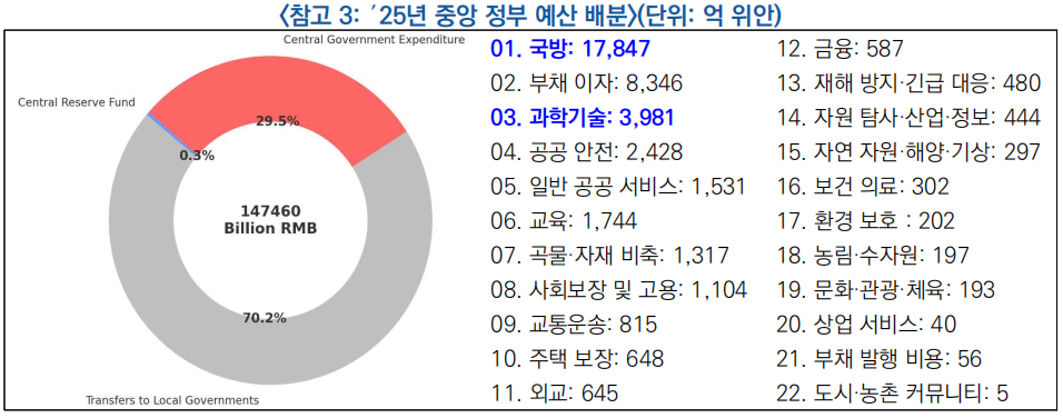 * ′25년 중국 중앙정부 예산은 국방 1조 7,846.65억 위안(약 360조 626억 원, 7.2% 증가), 과학기술 3,981.19억 위안(약 80조 3,205억 원, 10% 증가)으로 편성