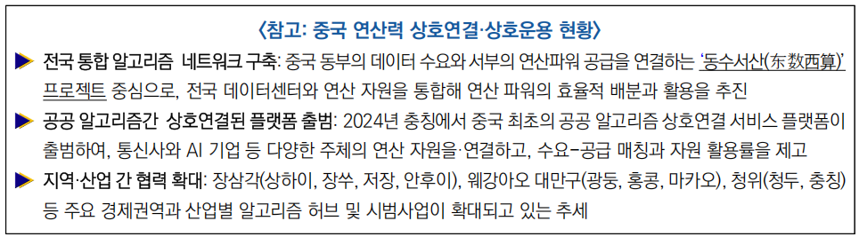○ 중국 중앙정부와 국무원은 이를 대응하기 위해 ‘전국 일체화된 알고리즘과 연산체계 조성’ 및 ‘국제 경쟁력을 갖춘 디지털 산업 클러스터 육성’을 중점 추진 과제 제시
