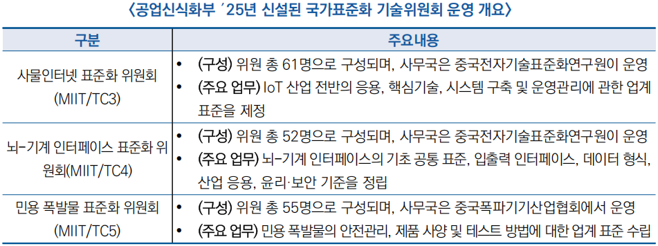 □ 중국 공업신식화부(MIIT)는 2024년 말 부처 최초의 국가표준화 기술위원회인 ‘인공지능 표준화 기술위원회’를 설립한 데 이어, ′25년 초에는 제조업 파일럿 생산 표준화 기술위원회를 신설함. 이어 ′25년 6월에는 사물인터넷, 뇌-기계 인터페이스, 민용 폭발물 등 3개 분야에서도 위원회를 추가 설립함(6.4)