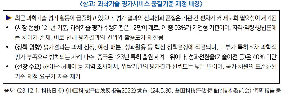 □ 중국은 과학기술 평가의 신뢰성과 제도화를 강화하기 위해, 과기부 주관으로 ‘과학기술 평가서비스 품질관리 규범’을 제정하고 ′25년부터 본격 시행함. 동 규범은 과학기술 평가서비스 전 과정을 아우르는 중국 최초의 국가표준임(25.6.16)