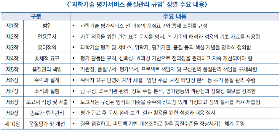 ○ (제정 배경) 과학기술 사업 확대에 따라 평가의 신뢰성과 객관성 요구가 증가하는 한편, 평가기관 간 역량 및 서비스 수준의 격차가 심화되고 있음. 이에 따라 과학적·공정한 평가체계 확립과 서비스 품질 제고를 위한 국가 차원의 통합 기준 제정이 필요
