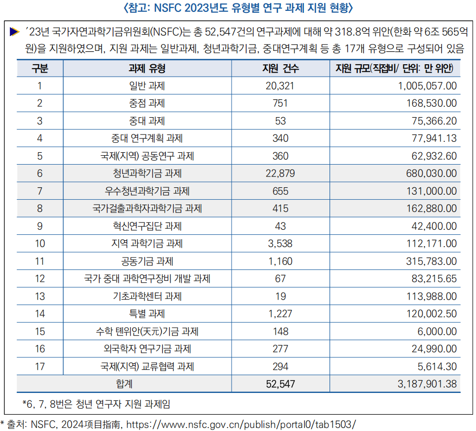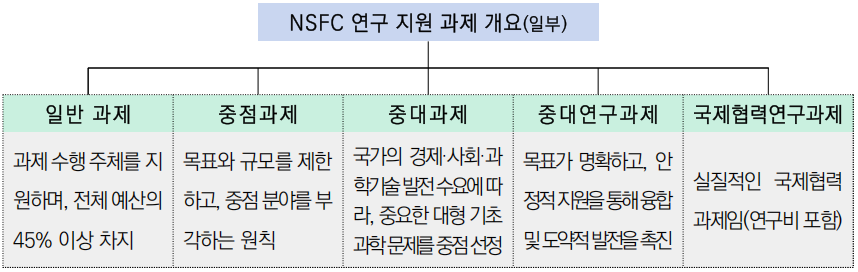 - (과제 분류) NSFC는 △탐색형(일반·중점·중대과제) △인재형(청년과학기금, 우수청년과학기금, 혁신연구집단 등) △도구형(중대 과학연구장비 개발) △융합형(기초과학센터, 공동기금 등) 4대 유형 중심의 과제 체계를 운영 중임