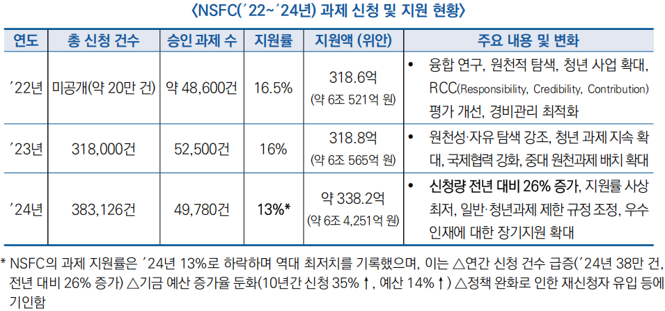 ![]() ○ (지원 추이) 최근 3년간 과제 신청 수는 급증하고 있으나 지원률은 하락세를 보이며, NSFC는 이에 따라 ‘양적 확대’에서 ‘질적 고도화’ 중심으로 정책 기조를 전환하고, 원천혁신, 청년 인재 육성, 국제협력 확대를 적극 추진 중임