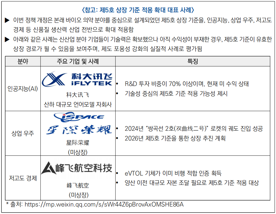 - (제5호 기준 적용 분야 확대) 인공지능, 상업 우주, 저고도 경제(eVTOL) 등과 같이 많은 투자와 개발 기간이 긴 미래 산업 분야에 대해 상장 수요가 늘어남에 따라, 이들 기업에도 제5호 상장 기준 적용을 확대하고 있음