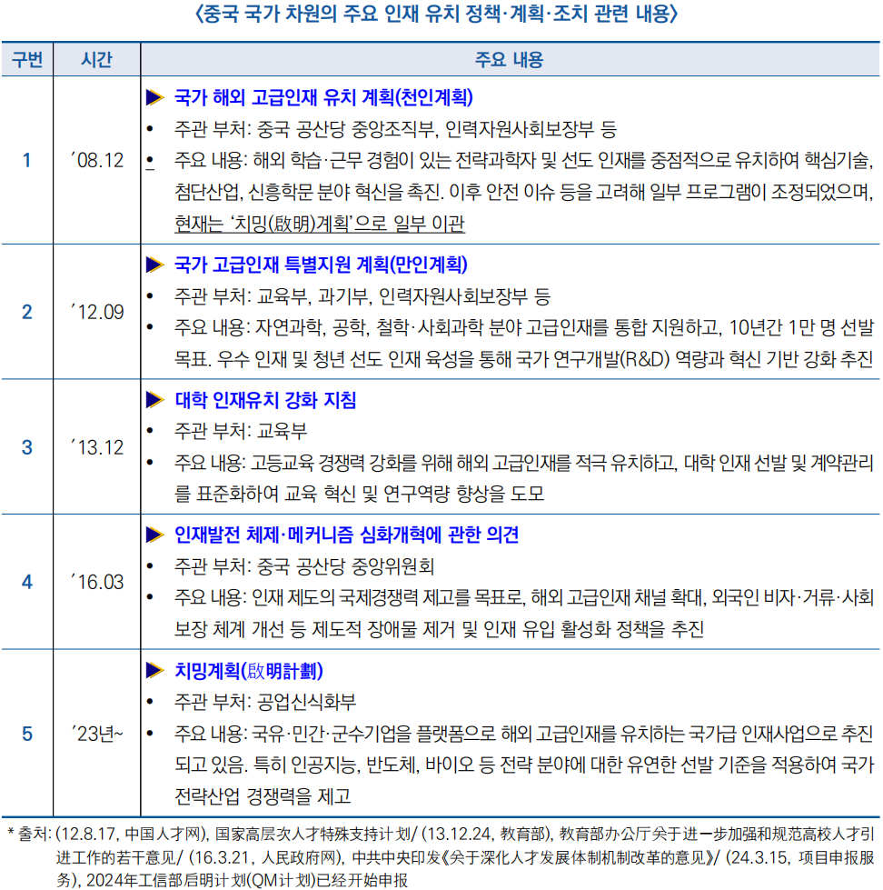 ![]() □ (중국 인재 유치 전략) 중국은 2000년대 초 ‘천인계획(千人計劃)’을 시작으로 해외 인재 유치를 본격화했으며, 이후 체계적·다층적 정책으로 발전시켜 옴. 최근에는 전략 분야 중심으로 비자, 거주, 생활 지원 요건을 대폭 완화하며 제도적 최적화를 추진하고 있음