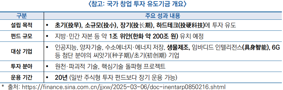 ![]() - 국가 전략 차원에서 설립된 ‘국가 창업 투자 유도기금’은 자금조달 확대, 투자 방향 강화, 사후 관리 체계화, 회수 경로 개선 등 전 주기에 걸쳐 전방위적인 정책 지침을 제공하고 있으며, 그 정책의 높이(전략성), 폭(범위), 깊이(구체성), 강도(지원 수준)면에서 모두 전례 없는 수준