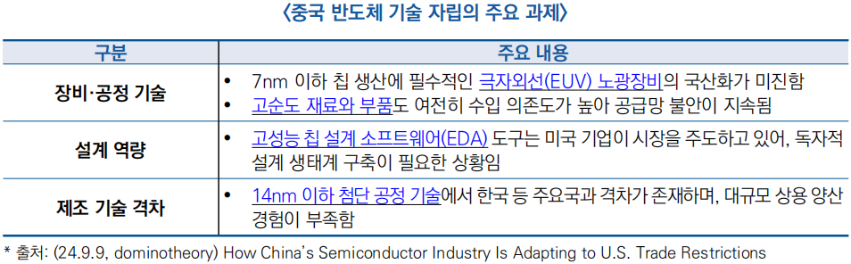 - (중국의 대응 과제) 중국은 첨단 반도체 기술의 국산화와 산업 자립 역량 강화를 국가 전략 과제로 추진하고 있으며, △ 장비·공정 기술 자립, △ 설계 역량 강화, △ 제조 기술 격차 해소 등 핵심 과제가 제기됨