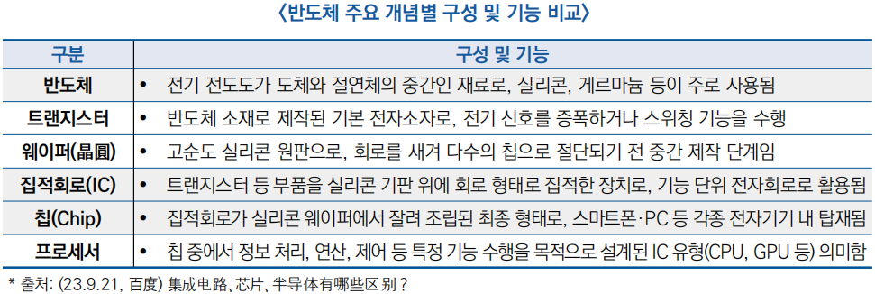 ○ (기술 개요) 반도체, 트랜지스터, 웨이퍼, 집적회로(IC), 칩, 프로세서는 반도체 산업을 구성하는 핵심 개념으로, 각 용어는 소재부터 부품, 기능 단위까지 서로 다른 기술적 단계와 역할을 수행