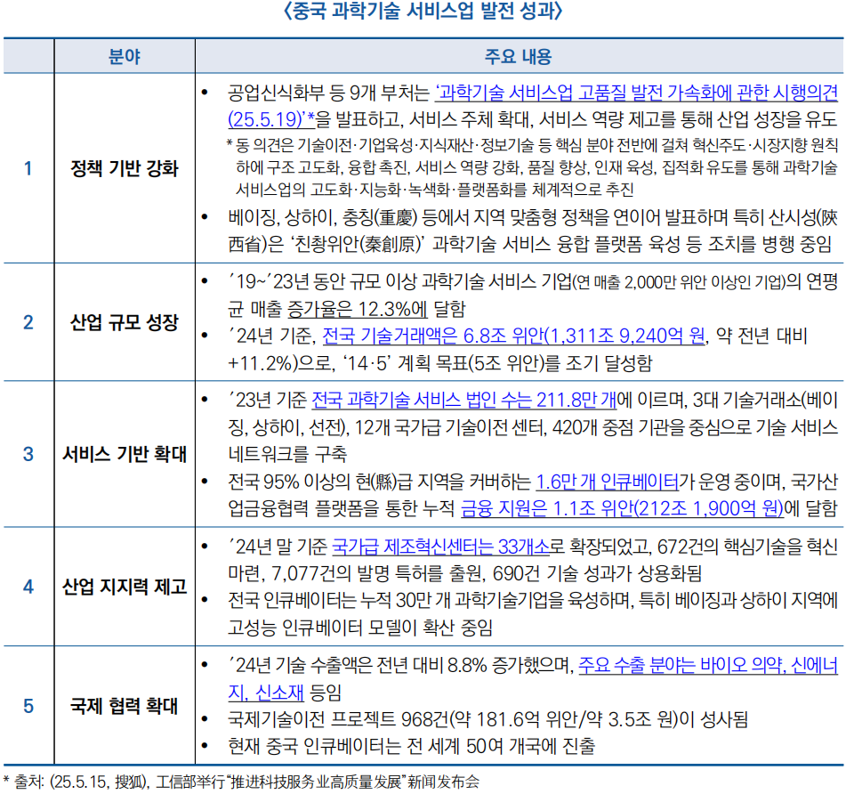 ○ (현황) 중국은 정책 기반 정비와 산업 기반 확충을 통해 과학기술 서비스업을 고부가가치 신흥산업으로 육성하고 있으며, 기술 혁신과 산업 고도화의 핵심 지지축으로 부상