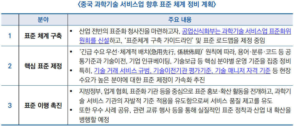 ![]() ○ (표준 기반 육성 전략) 중국은 과학기술 서비스업의 고품질 발전을 위해 표준 체계 정비를 핵심 수단으로 제시하고 있으며, 이를 △표준 체계 구축 △핵심 표준 제정 △표준 이행 촉진의 세 측면에서 단계적으로 추진할 계획