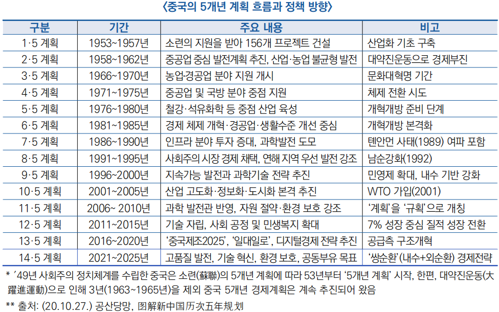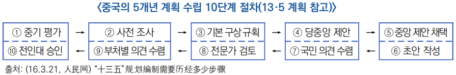 ![]() - (수립 절차) 과거 13·5계획의 경우 중기 평가부터 시작하여 총 10단계 절차를 거쳐 약 3년에 걸쳐 수립된 바 있음. 이는 중기 평가, 방향 설정, 당중앙 정책 제안, 초안 작성, 대국민 의견 수렴 및 심의·공표까지를 포함함
