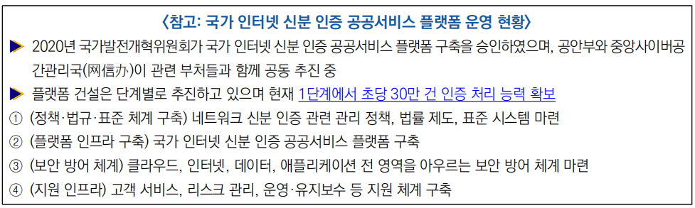 - (법률적 요구) 기존 ‘네트워크 안전법’ 제24조, ‘개인정보보호법’ 제62조 등에 따라, 국가 차원의 신뢰할 수 있는 신분 인증 체계구축이 요구됨