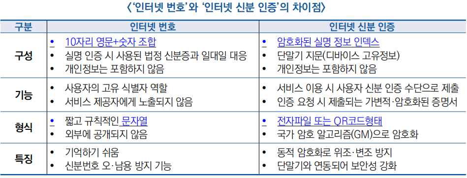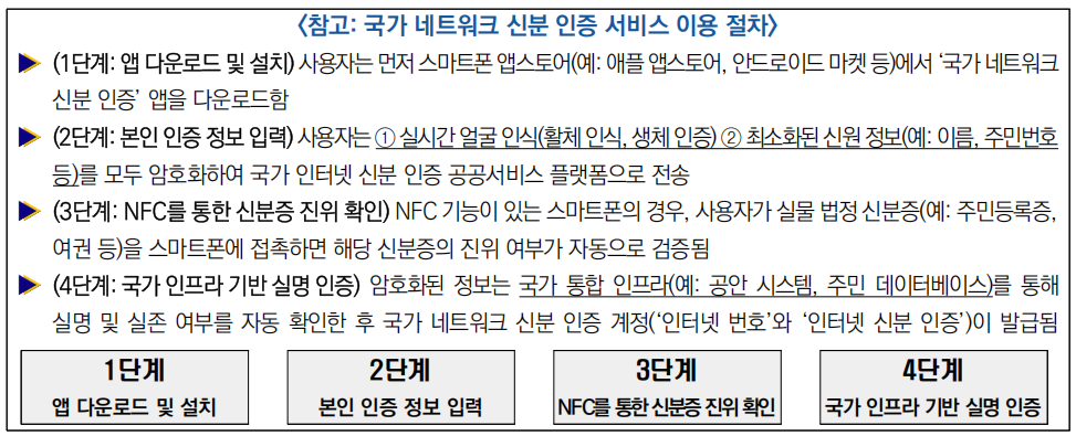 ![]() ○ (주요 내용) 국가 인터넷 신분 인증 공공서비스 플랫폼을 통해 ‘인터넷 번호’와 ‘인터넷 신분 인증’을 발급하고, 온라인 신원확인을 위한 제도적 기반 마련