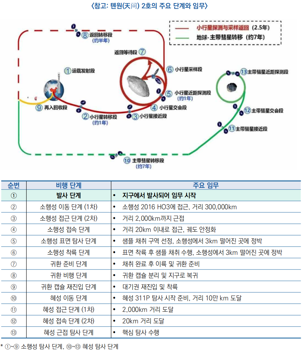 ![]() ○ (단계별 임무) 톈원 2호는 총 10년에 걸쳐 수행되는 장기 우주 탐사 프로젝트로, 임무는 총 13단계로 구성되며, 소행성과 혜성을 연속으로 탐사할 계획임
