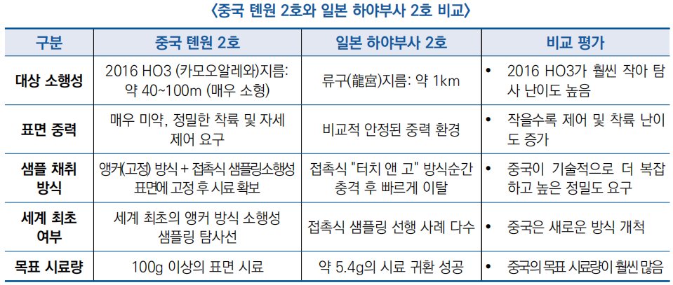 ![]() ○ (국제 비교) 중국 톈원 2호와 일본 하야부사 2호의 소행성 목표 및 샘플 채취 기술을 비교한 결과, 임무 난이도와 기술적 도전성 면에서 톈원 2호가 한 단계 위에 있는 것으로 평가됨