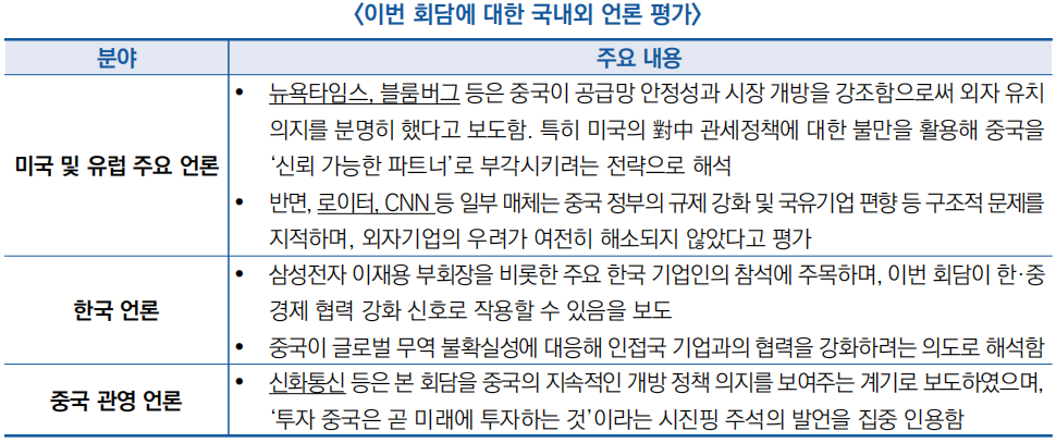![]() ○ (국내외 언론 평가) 주요 외신은 본 회담을 중국 정부의 외자기업 신뢰 회복과 대외경제 외교 강화의 일환으로 평가하고 있으며, 복합적인 국제 환경 속 외자 유치 기반을 다지기 위한 전략적 조치로 해석하고 있음