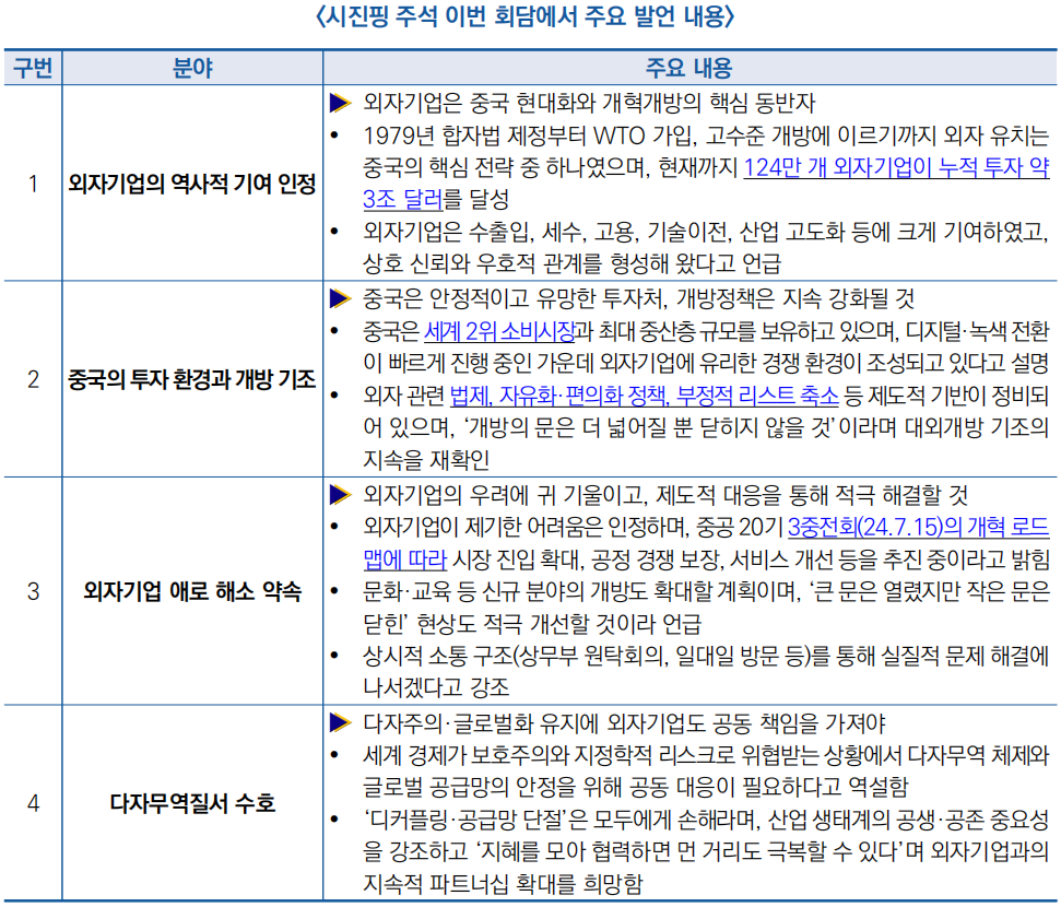 ○ (주요 발언) 시 주석은 △외자기업의 역사적 기여 인정, △중국은 항상 외자에 열려 있는 시장임을 재확인, △외자기업 애로 해소를 위한 제도적 보완 약속, △다자무역질서 수호 등 4대 핵심 메시지를 전달함