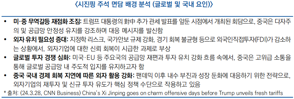 * 동 면담은 최근 1년간 진행된 세 번째 글로벌 기업인 회동으로, △′24.3.27. 블랙스톤 회장 등과 중미 갈등 해소 및 투자 확대 방안 논의, △′24.12.11. 미중무역전국위원회 대표들과의 면담을 통해 대외개방 환경 조성 의지를 표명한 바 있음