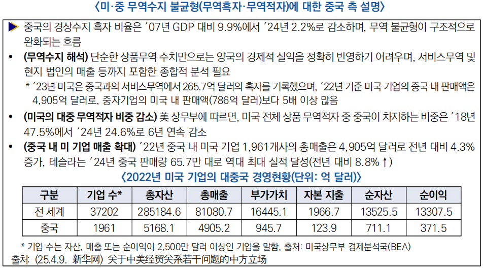 ![]() □ 25.4.8 (미·중 경제통상 현안에 대한 中 공식 입장 백서 발표) 국무원 신문판공실은 ‘중·미 경제무역 관계 관련 문제에 대한 중국 측 입장’ 백서를 발표하고, 무역·투자 현황, 협정 이행, 미국 측 조치에 대한 반박 및 중장기 협력 방향 등을 제시