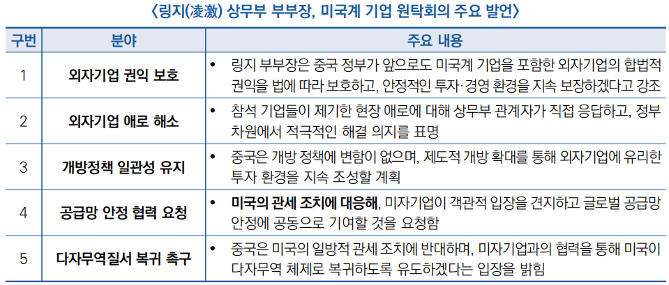 ![]() □ 25.4.6 (미국계 투자기업 대상 고위급 원탁회의 개최) 링지(凌激) 중국 상무부 부부장(차관급)은 테슬라, GE헬스케어, 메드트로닉 등 20여 개 미국계 기업 대표와 원탁회의(간담회)를 주재함