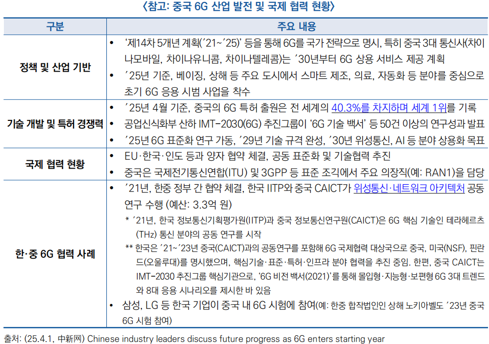 - 참고로, 한·중 양국은 현재 위성통신, Open RAN(Open Radio Access Network), 표준 공동제안 등 6G 기술, 산업, 생태계 전반에 걸쳐 전략적 협력 관계를 확대해 나가고 있음