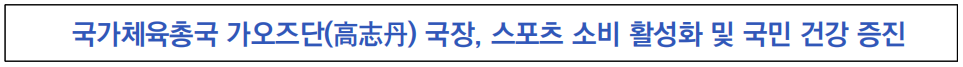 ![]() - 공공 체육시설 확충, 청소년·노년층 위한 맞춤형 스포츠 프로그램 확대 등을 통해 스포츠 산업의 다원적 가치 극대화 및 대중 스포츠 활성화 마련