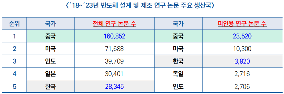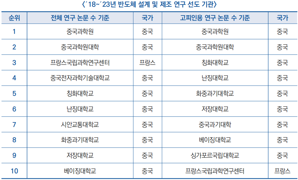 - ′18~′23년 반도체 설계 및 제조 연구 논문 발표 상위 10개 기관 중 9개가 중국 기관이 차지함