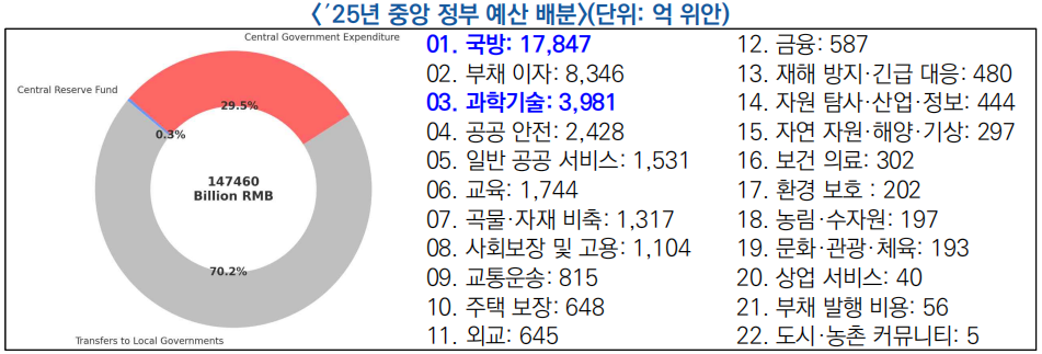 *′25년 전국 과기분야 예산은 12,464억 위안(약 251조 원)이며, 중앙정부 예산은 3,981억 위안으로 약 30% 차지