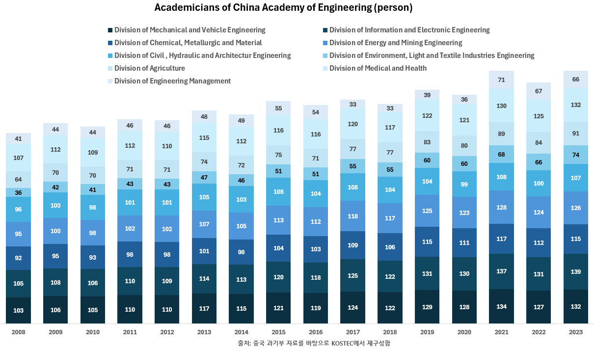 동향 게시판 게시글 제목, 작성일, 조회수, 내용을 포함합니다. 중국공정원(CAE) 원사 분야별 변화 추이(2008–2023년) (단위 : 명) 등록일2026.01.05 조회수11 첨부파일 Academicians of China Academy of Engineering (person).xlsx (10.4 KB) 목록