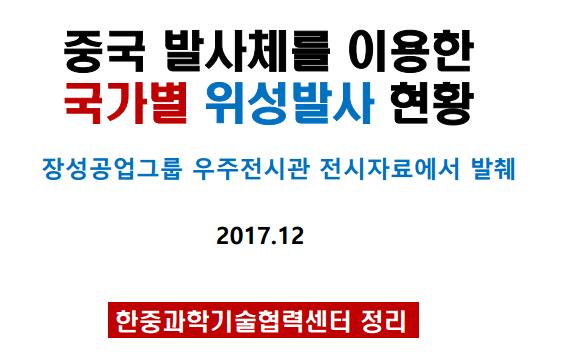 중국 발사체를 이용한 국가별 위성발사 현황 발행일2017.12.13 조회수1102 다운로드 바로보기 "중국 발사체를 이용한 국가별 위성발사현황"(PPT)은 장성공업그룹 우주전시관에 전시된 사진을 번역 가공 정리한 자료이다. 상세내용은 첨부파일을 참조. 이전글 차세대 인공지능 발전규획 다음글 빅데이터를 잘 활용하기 위해 먼저 알아야 할 것 목록