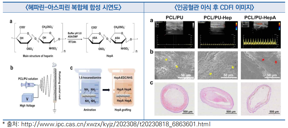 - 연구진은 강력한 항응고 효과가 있는 헤파린(heparin)을 항혈소판제인 아스피린과 혁신적으로 결합하여 복합체를 만든 후, 폴리카프로락톤(PCL)․폴리우레탄(PU) 복합관 표면에 접목하여 새로운 소구경 인공혈관을 개발