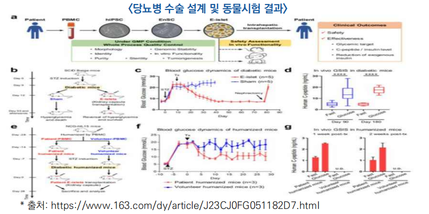 ○ 상하이장정병원 은호(殷浩) 교수와 중국과학원 분자세포과학 우수혁신센터 정신(程新) 교수 연구진은 세계 최초로 재생 인슐린 세포 이식을 통해 당뇨병을 완치