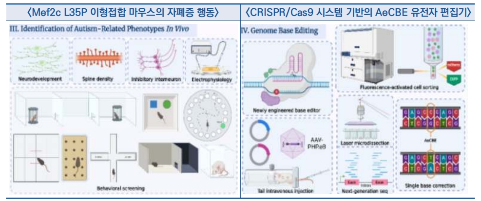 - Mef2c 자폐증 마우스 모델의 신경발달과 자폐증과 유사한 핵심 행동 표현형을 성공적으로 개선하기 위해 전체 뇌 기반 단일 염기 편집기술을 사용