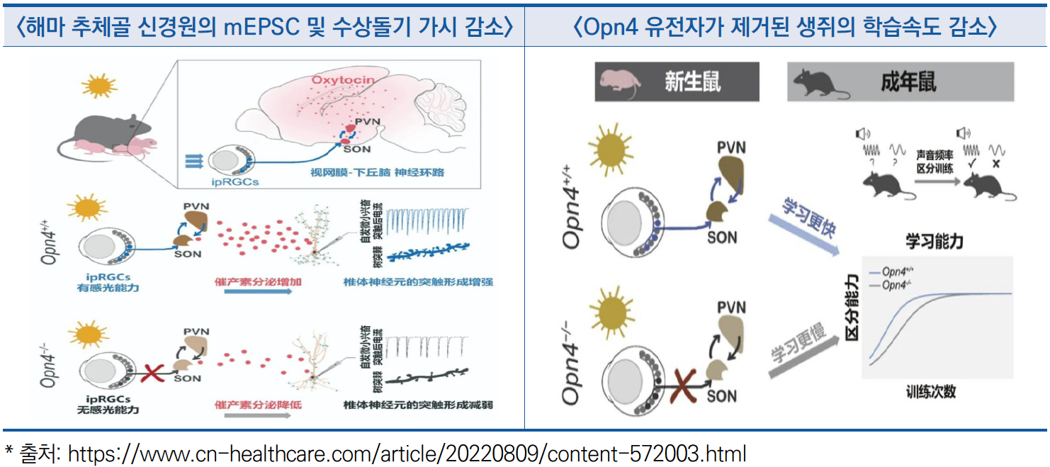 ○ 연구진은 신생 생쥐 모델의 Opn4 유전자를 제거하는 실험연구로 감광성 ipRGC 세포는 포유동물의 발육 초기 대뇌 고급인지 기능을 향상시키는 중요한 인자임을 규명