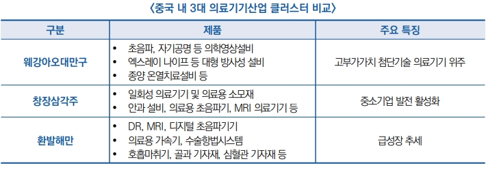 ● 중국 전체의 80% 이상을 차지하는 3대 의료기기산업 클러스터는 웨강아오대만구, 창장삼각주 및 환발해만이고, 특히 광동, 장수, 산동, 저장 및 허베이 5곳의 의료기기 생산기업 집중도가 54% 차지