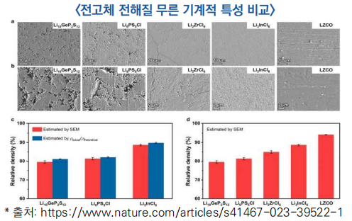 - 이번에 합성된 전고체 전해질의 실온 이온 전도도(離子電導率)는 2.42mScm-1까지 달성하고 우수한 변형성으로 300 메가파스칼(兆帕)의 압력에서 94.2%의 밀도 실현