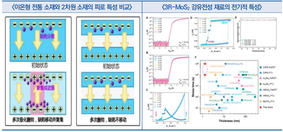 - 두께가 나노미터급에 이르는 2차원 적층 슬립 강유전성 재료(3R-MoS2)를 개발해 해당 재료로 만든 메모리 칩은 400만 회의 이용 사이클에도 피로파괴(fatigue failure)가 없음