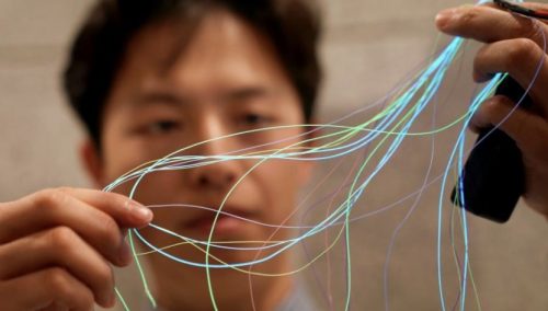 ![]() ![]() 푸단대학교 고분자과학 Peng Huisheng(彭慧勝) 교수 연구팀은 디스플레이 소자 제조 및 직물 편직 과정을 융합하여 대면적 플렉시블 디스플레이 패브릭과 스마트 통합 시스템을 달성했다. 해당 연구 성과는 국제학술지 “Nature”에 온라인으로 게재되었다. 지름이 수십 미크론에서 수백 미크론인 유연한 섬유에 프로그램화 제어가 가능한 발광점 배열을 구성하는 것은 패브릭 디스플레이 분야의 주요 어려움이다. 연구팀은 발광 활물질의 고분자 복합섬유와 투명 전도성의 고분자 겔섬유 두가지 기능성 섬유를 개발했다. 두 섬유의 편직 과정에서 경사와 위사 교직으로 전계발광 유닛을 형성하고, 효과적인 회로 제어를 통해 새로운 유형의 플렉시블 디스플레이 패브릭을 달성했다. 발광 경사는 일반 실과 비슷해 보이지만 전류가 통하면 바로 발광할 수 있다. AC 전압을 가한 후, 섬유의 고분자 복합발광활성층이 연결점 구역에서 전기장에 의해 여기되어 하나하나의 발광 “픽셀”을 형성한다. 따라서 전기장의 여기하에서, 전극과 발광층은 물리적 결합에 의해 효과적인 발광을 달성할 수 있다. 연구팀은 산업 편직 장비를 이용하여 길이 6m, 너비 0.25m, 약 50만개 “픽셀”의 디스플레이 패브릭을 제조하였으며 일부 실제 응용의 해상도 수요를 충족할 수 있다. “발광 경사”의 지름은 0.2mm-0.5mm의 정밀 조절이 가능하여 아주 가늘고 부드러운 특성을 부여한다. 짜여진 옷은 인체의 불규칙적인 윤곽에 바싹 달라붙을 수 있고, 얇고 가벼우며, 통기성이 양호하다. 연구팀은 “전도성 위사”의 역학적 성능에 공력을 들여 고탄성의 투명한 고분자 전도성 섬유를 개발함으로써 “발광 경사”와 교직할 때 자체적응 탄성 변형이 발생하여 안정적인 접촉 계면을 형성하도록 했다. 실험 결과, 두 섬유가 상대적인 슬라이드, 회전, 만곡 등이 발생할 경우, 교직 발광점의 밝기 변화 범위는 5% 이내로 제어된다. 접힘, 당김, 눌림 등 외력의 작용하에서도 밝기의 안정성을 유지하며 백번 이상의 세탁기 세척을 견딜 수 있다. 연구팀은 해당 편직 방법을 기반으로 태양광 직물, 에너지저장 직물, 터치감지 직물 및 디스플레이 직물의 기능 통합 시스템을 달성하여 에너지 전환과 저장, 감지와 디스플레이 등 기능을 통합한 직물 시스템이 가능하게 되었다. 해당 시스템은 실시간 포지셔닝, 스마트 통신, 의료 보조 등 사물간 인터넷 및 인간-컴퓨터 상호작용 분야에서 양호한 응용 전망이 있다. 정보출처 : http://www.stdaily.com/index/kejixinwen/2021-03/11/content_1087766.shtml |
