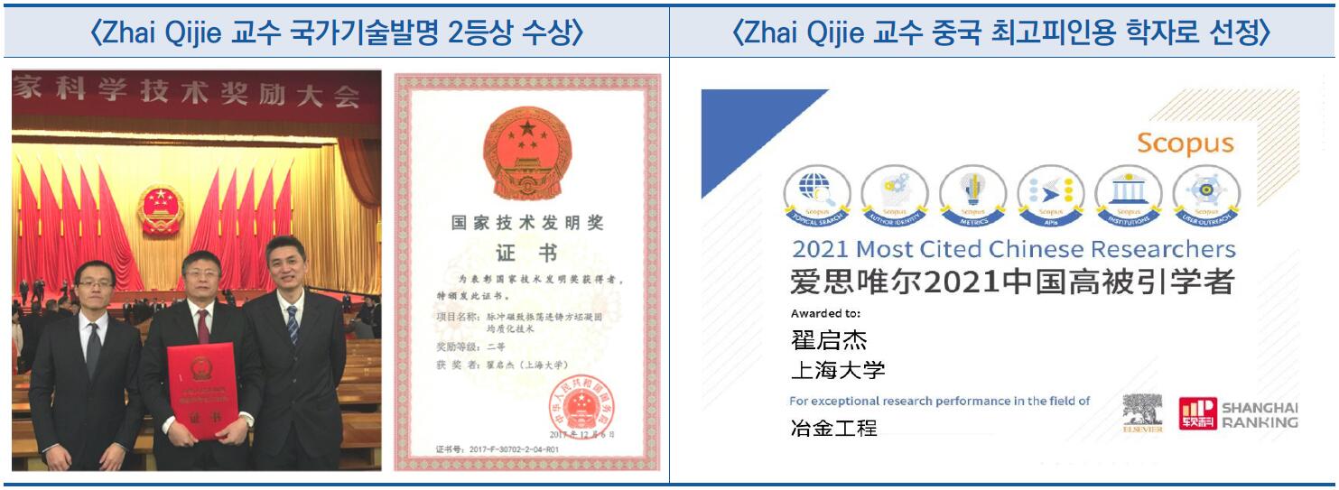 - 해당 기술은 ′20년 국가 야금과학기술 1등상을 수상하였으며, 금속응고 열 시뮬레이션, 펄스전류・자기장 하에서 응고 및 철강 응고 등 다양한 분야에서 발표된 논문에 다수 인용됨