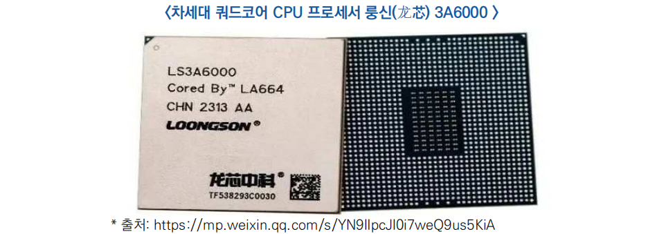 ○ 중국 대표 CPU 개발업체인 룽신중커(龙芯中科)는 차세대 쿼드코어 CPU 프로세서 룽신(龙芯) 3A6000 개발에 성공