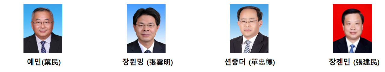 ㅇ (부부장 겸 당조성원) 장젠민 (張建民,1964년생), 석탄공업부태원설계연구원 원장(‘00), 산서성 부성장(‘08), 공업정보화부 당조성원 및 국가담배관리국 국장(‘18) 등 역임