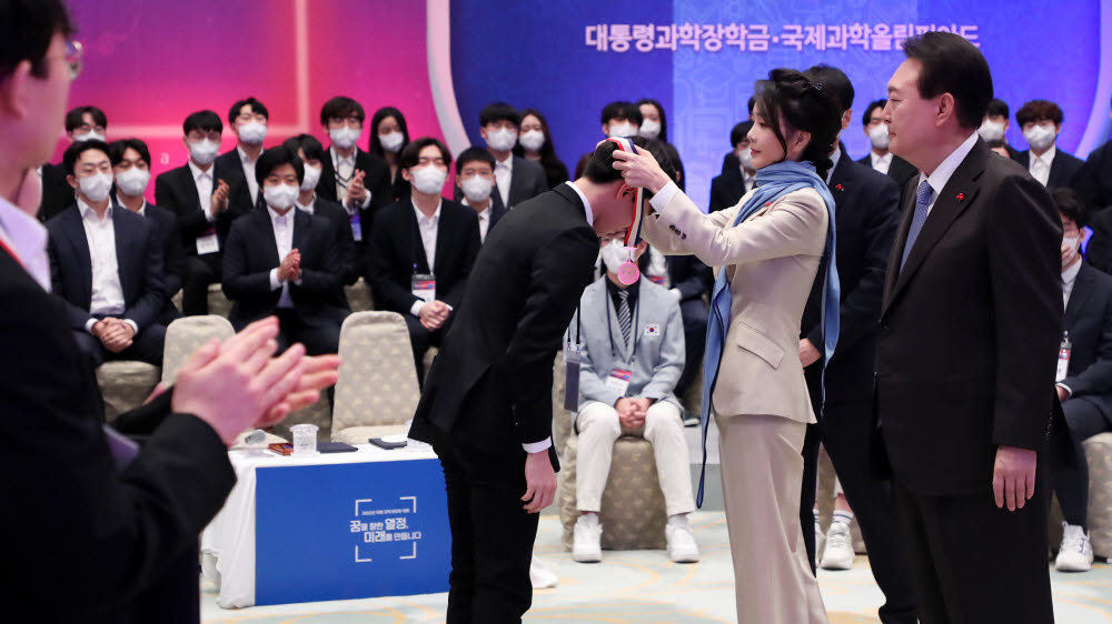 尹锡悦总统和金建熙女士向获得总统科学奖的140名大学生颁发了证书和奖章,向44名国际科学奥林匹克获奖中学生颁发了纪念牌和奖品。
