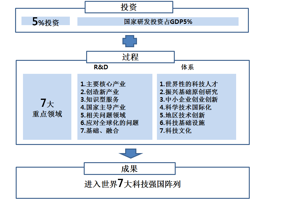 ![]() 作为李明博政府科技政策‘品牌’的577战略,其目标是:2012年国家总研发投资比重增加至GDP的5%;重点培养7大 R&D领域;通过使7大体系先进化、效率化的50个重点推进课题,至2012年进入7大科学技术强国阵列。 为实施《李明博政府科学技术基本计划》,韩国政府根据《科学技术基本法》制定“年度实施计划(Rolling Plan)”。年度实施计划由4章节及附录组成。主要内容摘要如下。 1.概要:制定计划的意义及实施机关、项目和投资。 ▶ 意义:为实施《李明博政府科学技术基本计划》,韩国政府根据《科学技术基本法》制定“年度实施计划(Rolling Plan)”。 ▶ 实施机关: 实施科学政策、国家研发计划的23个中央行政机关 (14个部、8个厅、1个委员会) ▶ 项目:577战略50项重点课题的有关政策及项目 → R&D项目:重点课题及有关项目 → 非R&D项目:科学文化普及等 → 预算外项目:科技政策、制度改善 ▶ 投资:13.5533万亿韩元 2.2011年主要推进计划 ▶ 实现5%投资 → 2011年政府R&D预算:14.9万亿韩元(增长8.6%) → 通过加强国家科技委员会功能、推动国家研发项目等措施提高R&D投资效率 ▶ 集中扶持7大R&D:总投资8.0923万亿韩元,与2010年7万亿韩元相比增加12.4% → 主要核心产业技术进步:汽车、造船、机械制造、半导体等 (0.4274万亿韩元) → 加强新产业形成的核心技术开发: 下一代S/W、癌症诊断与治疗等 (1.1616万亿韩元) → 扩大知识型服务产业技术开发: 融合型内容、高新物流等 (0.1760万亿韩元) → 保障国家主导技术核心力量: 航天航空、原子能与核聚变、国防等 (2.5392万亿韩元) → 加强待开发领域的研发: 人兽共患病、零部件与材料等 (1.0588万亿韩元) → 推动应对全球化问题的研发: 新再生能源、预测与适应气候变化等 (0.9401万亿韩元) → 促进基础、融合技术开发: 生物芯片与传感器、智能机器人等 (0.36万亿韩元) 此外,政府出资研究机构的支持项目 ▶ 推动7大体系: 总投资5.2582万亿韩元,与2010年4.7192万亿韩元相比增加11.4% → 世界性的科技人才 (0.5101万亿韩元) → 振兴基础原创研究 (1.3945万亿韩元) → 支持中小企业创业创新 (1.2935万亿韩元) → 战略性科学技术国际化 (0.1463万亿韩元) → 加强地区技术创新 (0.8710万亿韩元) → 强化科技基础设施 (0.5663万亿韩元) → 普及科技文化 (0.1077万亿韩元) 此外,政府出资研究机构的支持项目 3.2011年主要内容 ▶ 培养科学技术人才及创造就业岗位 ▶ 加强创造性基础、原创研究 ▶ 支持绿色技术及新产业技术 ▶ 加强对提高国家未来地位项目的支持 4.2011年实施日程 ▶ 2010年科技基本计划实施成就报告(2011.04) ▶ 2012国家研发预算分配方向(2011.07) ▶ 制定科技基本计划2012年度实施计划(2011.12) |