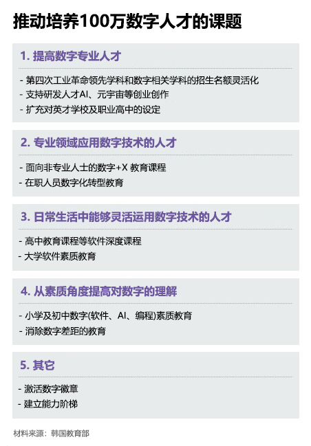 8月22日,韩国教育部与科学技术信息通信部、雇佣劳动部等相关部门联合发表了《数字人才培养综合方案》,方案提出了到2026年为止培养100万名数字人才的计划。