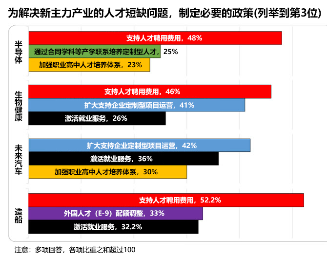 人才短缺的感受度依次为造船(52.2%)、半导体(45.0%)、未来汽车(43.0%)、生物健康(29.0%)。对于人才短缺原因的提问,造船(38.3%)和半导体(46.7%)回答称雇佣后频繁的离职和退休。未来汽车和生物健康中,有经验的应聘人员不足分别占44.2%和55.2%,占比较高。