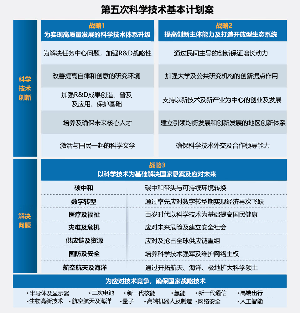 第五次基本计划是提出科学技术发展相关中长期政策目标、基本方向的最高计划,反映了尹锡悦政府科学技术相关的29个国政课题。以"科学技术创新引领的大胆未来"为蓝图加强国家研究开发(R&D)战略性、建立以民间为中心的科学技术创新生态系统、解决以科学技术为基础的国家悬案为主要方向。