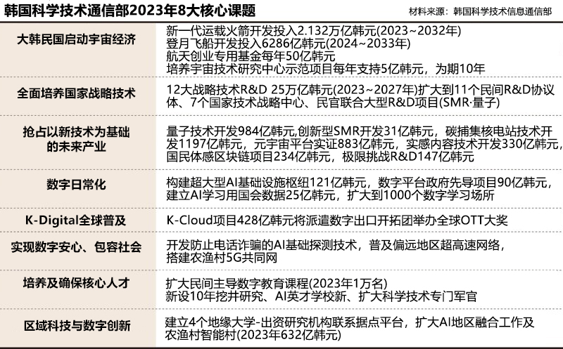 12月28日,韩国科学技术信息通信部部长官李宗昊向总统尹锡悦报告了包含实现全球科学技术强国和数字模范国家的8大核心课题的新年工作计划。明年将与提出"数字强国"蓝图的"大韩民国数字战略"联系起来,计划选出250个课题,规模为700亿韩元(约合3.8亿元人民币)。在现有的普通、医疗领域的基础上,将增设AI半导体、工商业者、全球领域,集中培养5个领域。