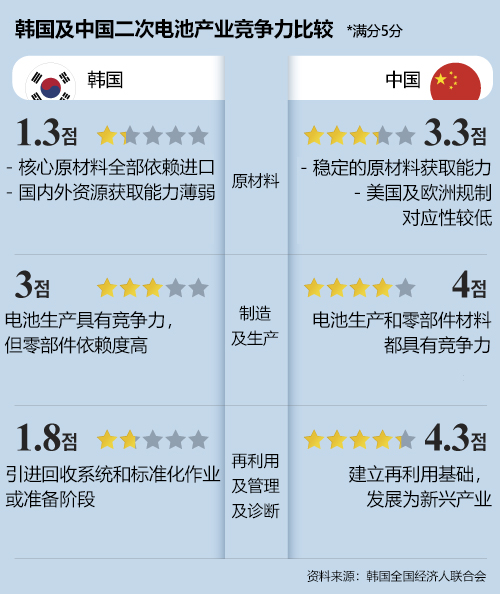 | 韩国在二次电池领域的产业竞争力不及中国 | ||