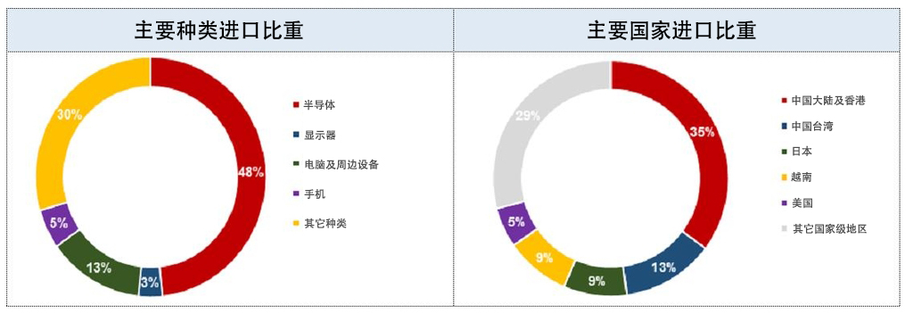 各进口对象国的进口额依次为中国大陆及港澳(40亿美元)、中国台湾(14.4亿美元)、越南(10.2亿美元)、日本(9.9亿美元)、美国(6.3亿美元)。