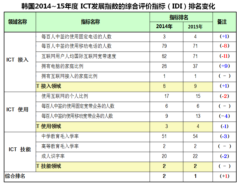 ![]() 据国际电信联盟(ITU) 11月发布的报告显示,2015年,韩国时隔两年重返全球167个国家和地区的信息通信技术发展指数(ICT Development Index)首位, 这一指数代表了网络及手机普及率。 ICT发展指数分为ICT接入、ICT使用以及ICT技能三大板块,韩国的综合指数是首位。 未来创造科学部崔在裕副部长参加了11.30日~12.2日在日本广岛召开的ICT指标会议,他在获奖感言中表示韩国将会进一步与发展中的ITU会员国分享韩国ICT发展经验和教训。并且会以领先于世界的ICT基础设施为基础,加快ICT和其他产业的融合速度,集中政府的政策力量,使韩国成为网络经济强国。 今后,未来创造科学部将继续加强与ITU的研究合作,使ICT发展指数能够更加准确地测定和评价快速变化的ICT技术和服务,并会继续与在ICT数据收集和分析中存在困难的发展中国家扩大合作,以便于提高他们的ICT水平。 详见图表《韩国2014~15年度 ICT发展指数的综合评价指标(IDI)排名变化》。 资料来源: 韩国未来创造科学部 |